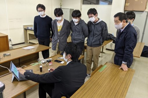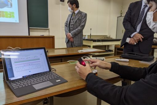 講演後には、持参された2種類のセンサを使って実際ににおいのセンシングをデモンストレーションされました。最初は16チャンネルのセンサー出力を機械学習させて、においの判別をするというものです。パソコン上で、チャンネル信号がリアルタイムで見られますので、センシングしている様子がよくわかりました。