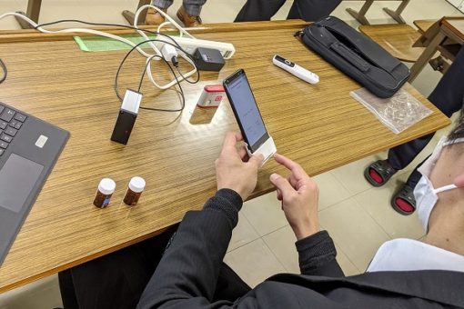 もう一つのセンサは、スマホに取り付けて使うアタッチメント形式のもので、こちらは8チャンネルです。スマホはいろいろなことができますが、においまで測れるというのは軽い衝撃でした。スマホに息を吹きかけると、こちらもリアルタイムでセンシングした出力が確認できます。口臭とかアルコールチェックに使えそう、といったアイデアは誰でも思いつきますね。呼気のにおいから健康状態がモニタ出来る日も近そうです。