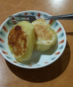 これは高齢者と一緒に作り提供した「さつま芋きんつば」で、形は少し悪いですが、一から手作りしました。(撮影協力:緑寿会特別養護老人ホーム新山荘)