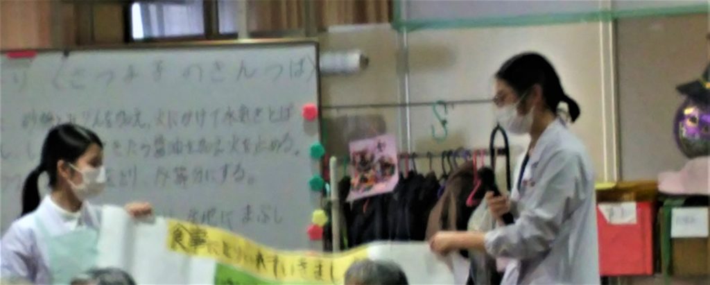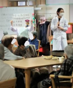 学生たちは、事前に指導管理栄養士より実習課題をいただき、また自らも実習における研究課題を検討・考案し、実習先で実践します。実習課題には、施設利用者とのおやつ作り・調理指導から、そのおやつ等を題材にした栄養教材を作成し、利用者の前で発表します。この時は丁度、デイサービス利用者への栄養指導をしているところです。感染予防に細心の注意を払いながら、学内でしっかり練習した発表手順に従い、利用者と会話も交わしながら上手く話しを進めていました。