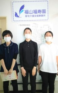 こちらは、学生と指導管理栄養士の写真です。学生は厨房での調理作業やおやつ作り、施設内での栄養ケア・マネジメント(栄養管理業務)の指導を受けました。指導管理栄養士が本学の卒業生であるためか、緊張しつつもとても楽しく充実した実習であると、嬉しそうに話しくれました。(撮影協力:特別養護老人ホーム福山福寿園)報告:I・K