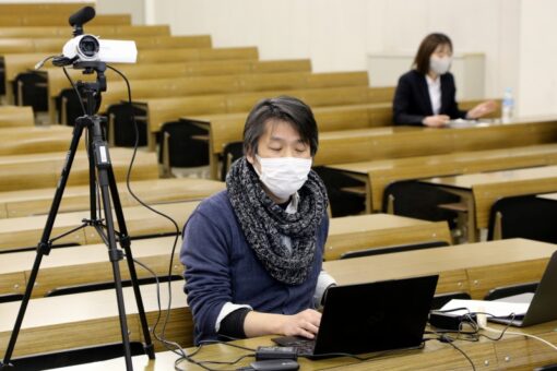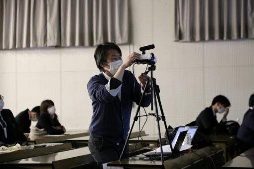 ウェブ配信には使い慣れたZoomを利用しました。 広岡教授が個人所有の機材(ビデオカメラ、360°会議用マイク、パソコン、三脚など)を供出し、教室の中央に音響エンジニアのように陣取って、1人で配信業務をされました。 まさに八面六臂の活躍です。 配信に気を使うあまり、発表内容に対して質問する余裕が無かったそうです。