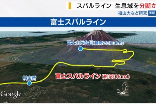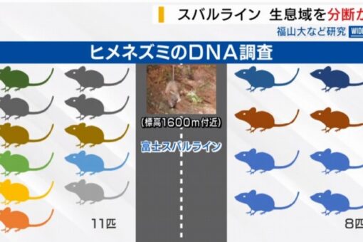 富士スバルラインの道路両脇で生息する野ネズミのDNAが異なることを発見したという研究です。 富士スバルラインによって、道の両側でヒメネズミの移動が制限され、それぞれ別々に進化していったというものです。