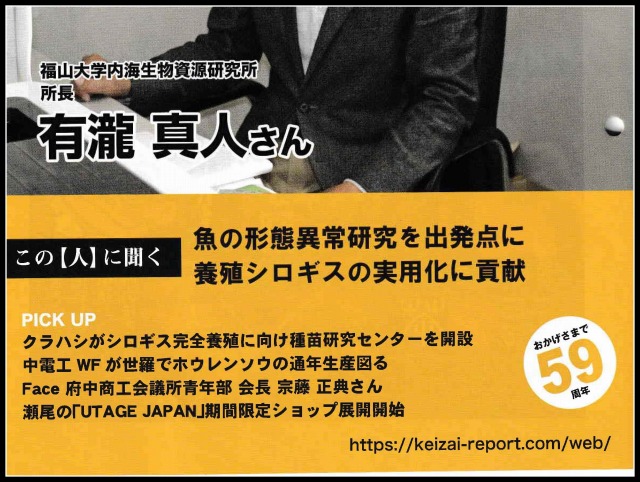 【内海生物資源研究所】有瀧所長 びんご経済レポートの表紙に登場