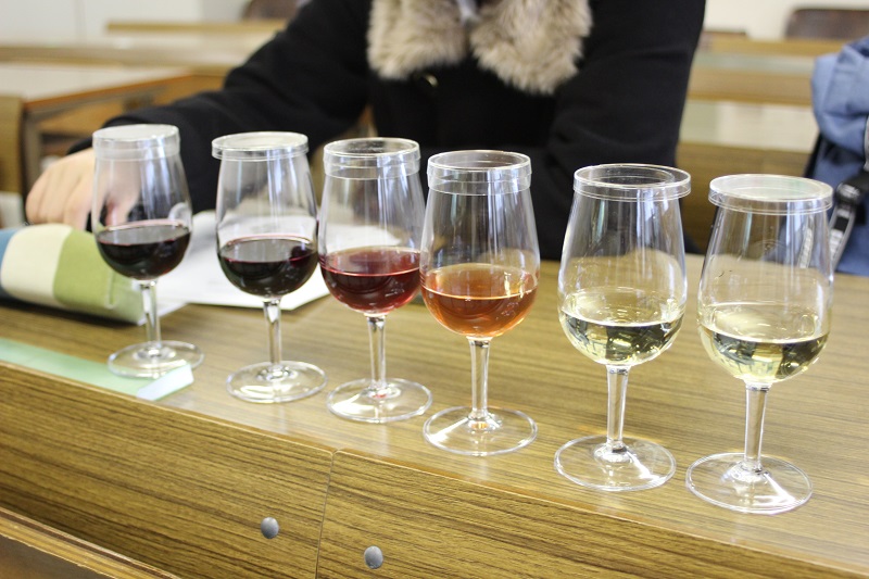 発酵食品は微生物の力を利用して、食品の保存性と風味を高めたものです。人の手で働きをコントロールして利用する「発酵」はバイオテクノロジーそのものですね。生物工学科ではカリキュラムの一環でブドウ栽培とワイン造りを行っています。模擬授業では赤ワインが赤くなる仕組みや、私たちに馴染みの深い様々な発酵食品の造り方を解説します。吉﨑准教授による講義です。
