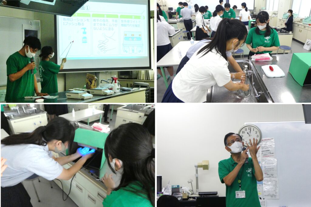 1つ目は、衛生管理の基本となる「手洗い」に焦点を当て、その必要性や手洗いの出来具合が十分かどうか確認する実験を、実際に学生実験で学んだ2年次生と3年次生が説明しながら行いました。