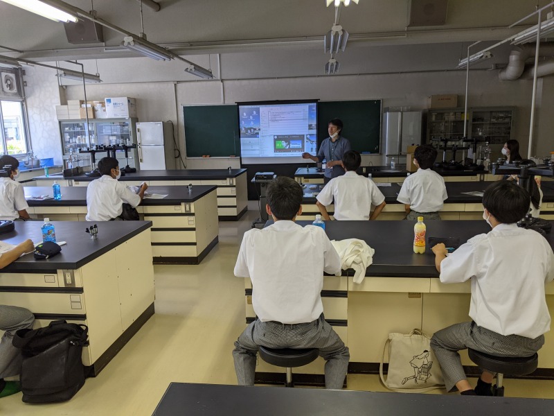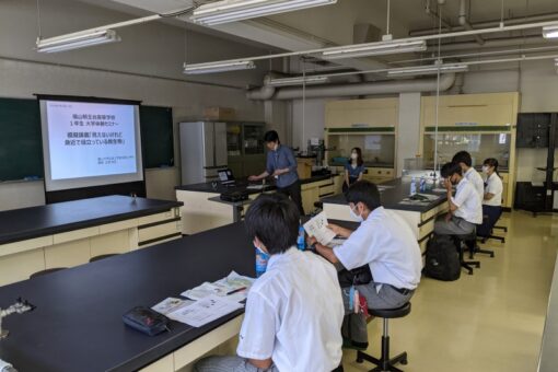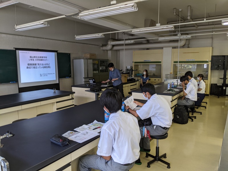 夏真っ盛りの7月29日(木)の午前、広島県立福山明王台高校の1年生が福山大学の見学に来られました。 2部制で、自分が興味のある学部・学科を選びます。 生物工学科にも見学に来られましたので、その様子をご紹介します。