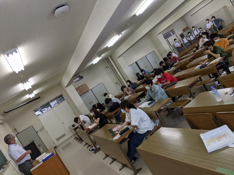 模擬講義の後は研究室の見学と、実際の授業の見学を行いました。1時間目は英語の時間で、アメリカのノース・キャロライナ州で働く卒業生とオンラインで繋いだ授業でした。 2時間目は山本教授の代謝学の授業でした。
