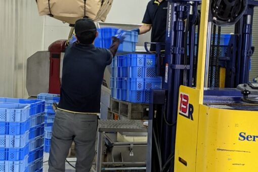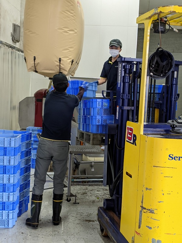 仕込用ブドウの入った籠をフォークリフトで運びます。1回で3.5トン仕込みます。