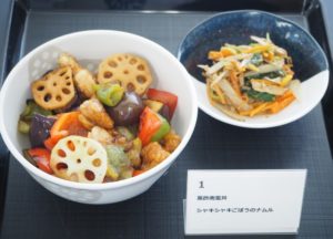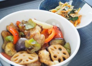 ゴロゴロと大きな野菜がカラフル&食べ応え抜群などんぶり。味付けは黒酢を使った南蛮ダレで、フライパンの余熱で和えたことで香ばしさも加わっています。副菜はごぼうをナムルに使うという新しい発想で、ごぼうのシャキシャキ感を楽しむことのできる一品となりました。