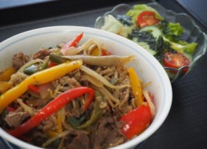 たっぷりの牛肉に、旬の野菜が華やかなどんぶりです。ボリューム満点のどんぶりに、さっぱりとしたドレッシングのサラダで、飽きずに食べられます。