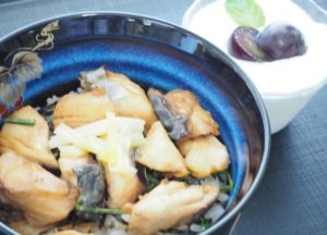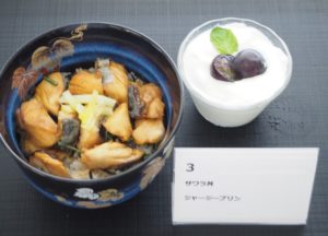 岡山県のサワラをどんぶりにアレンジした作品です。岡山の特産品である黄ニラも添えられ、これまでにないどんぶりに仕上がっています。ジャージープリンにはピオーネがのっており、岡山の食材満載の作品となりました。
