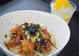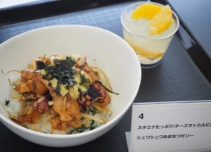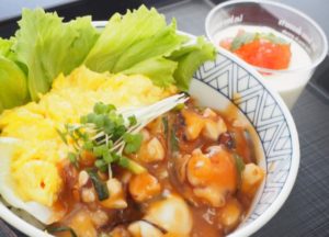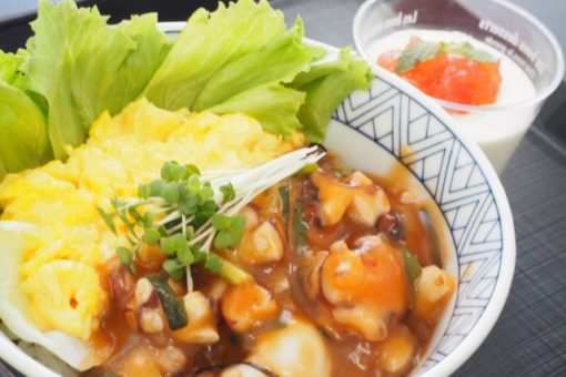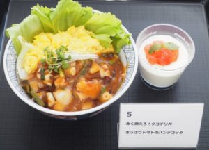 広島県の特産であるたこを使用し、エビチリならぬタコチリとした、アイデアどんぶり。ほどよい辛みが食欲をそそります。パンナコッタのソースは野菜のトマトを使い、甘酸っぱいさっぱりしたデザートとなりました。また、二品とも”赤色”ですが、広島カープの赤色も表しているそうです。