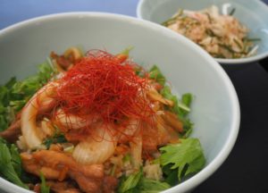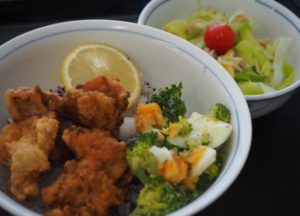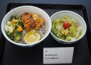 鶏もものからあげが、レモンの風味でさっぱり食べられるどんぶりです。副菜のサラダにはみじん切りのレモンが入っており、レモンの酸味が食欲をそそる作品です。