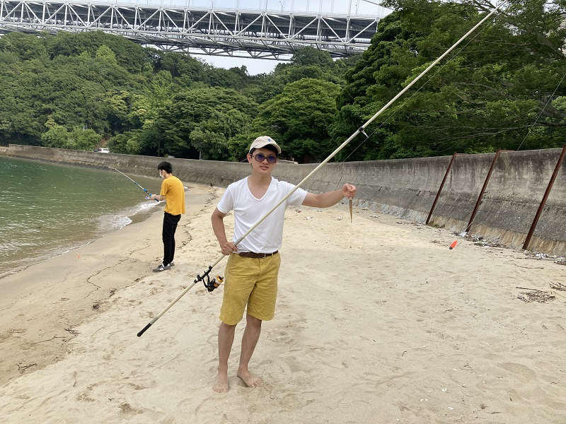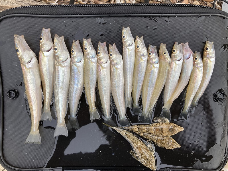 生物工学科の動物学研究室では、月に一度の釣りを行い、卒業研究のサンプルを集めています。砂浜海岸によくあらわれるのがシロギスで、これがメインターゲットです。年間の食性の変化を調査しています。今回のサンプリングは絶好調でしたね。