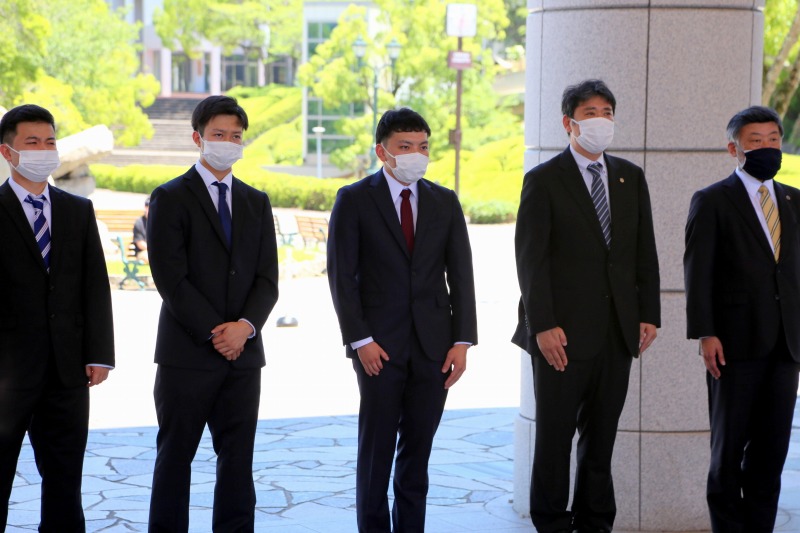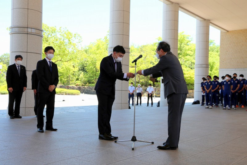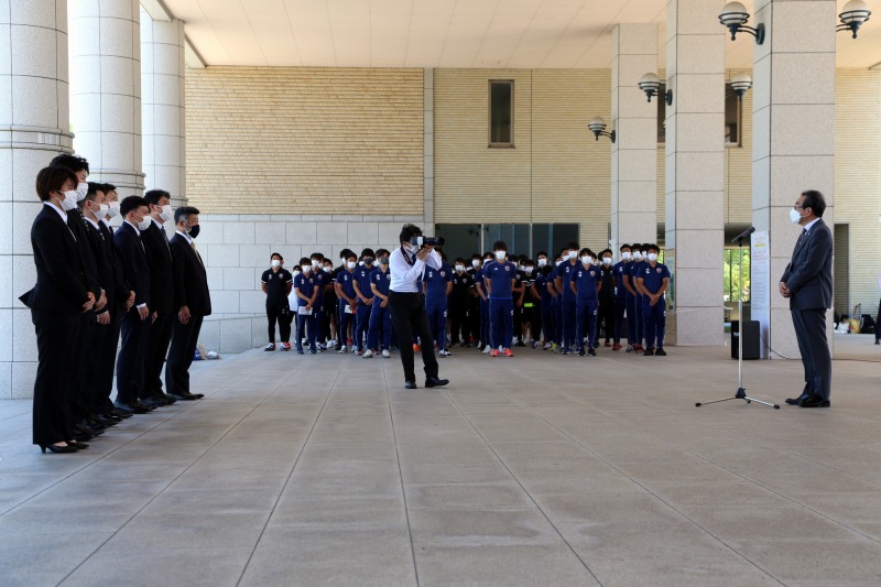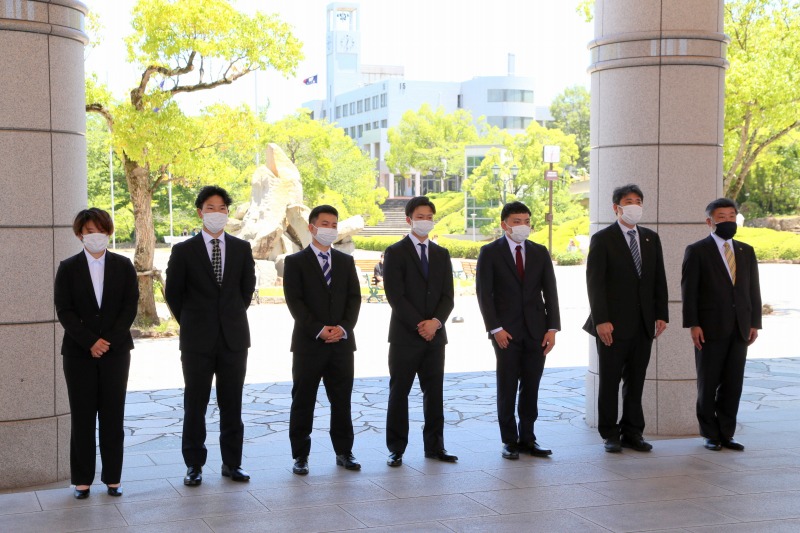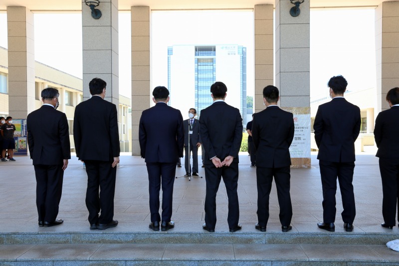 壮行会は全国大会に出場する選手や団体にエールを送るイベントで、大塚学長や鶴崎学生委員長他が参加しました。 今回は激励されるのは田中君だけなので、顧問の香川教授や剣道部の部員、そしていつもは壮行会をやってもらう側が多いサッカー部も参加して、賑やかに行われました。 その様子を写真でご紹介します。