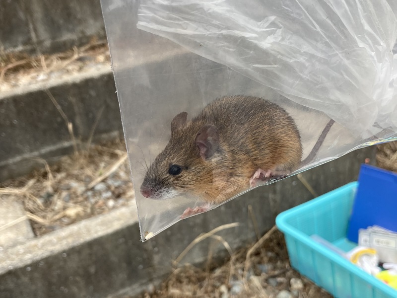 さすがは生物多様性が豊かな福山大学。アカネズミ10頭とたくさんの昆虫を捕獲し、DNAを分析するための組織を獲得することができました。アカネズミの捕獲については、生物工学科佐藤が広島県から許可を得ています。