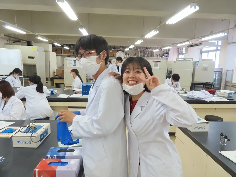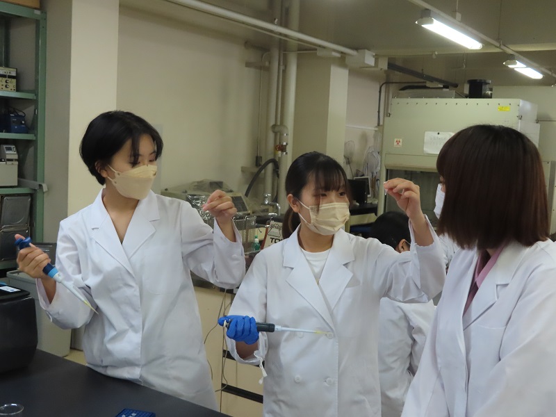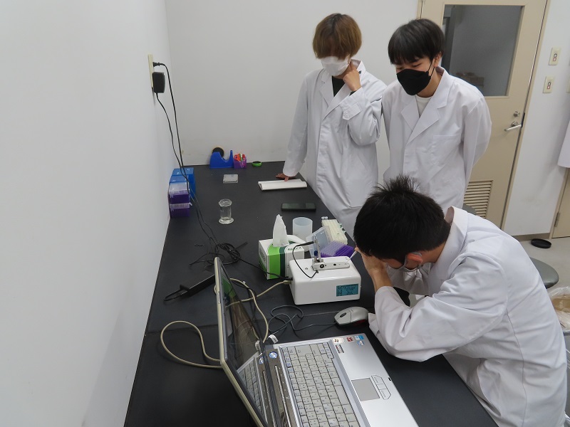 生物工学科の実習では班ごとに実験を進めることが多く、メンバーと不安なところを確認し合いながら、実験を行います。下の写真は濃度の希釈方法を確認し合っている様子です。多くの実験では、先人たちの経験により「なぜその濃度?」と思わず言ってしまうような適切な濃度が存在します。そういった濃度に希釈したり、濃縮したりする作業は多いのです。実習によって雰囲気は異なりますが、生物多様性実習は和気藹藹です。