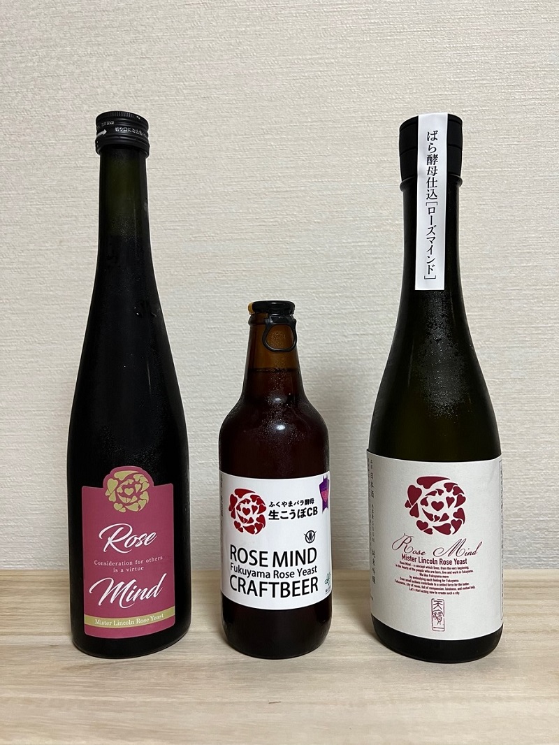 微生物による発酵食品は多種多様ですが、私たちはパンやお酒に使われる酵母に注目して研究しています。酵母は英語でイーストと言いますので、こちらの方が聞き馴染みがあるかもしれませんね。その中でも私たちは、これまでに福山市の市花である「バラ」から酵母を分離し、バラ酵母としてパンやお酒を商品化しています。以下の写真は、バラ酵母から作ったドライイースト、福山市で販売されたバラ酵母パン、そしてバラ酵母を使ったお酒の「ローズマインドシリーズ」です。私たちは様々な発酵食品を世に送り出すことに成功しています。
