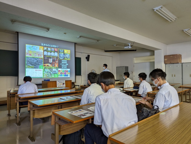 1時間目は佐藤教授による生物多様性と遺伝子解析の話、2時間目は久冨教授による酵母の講義がありました。 昼食をはさんで午後は吉﨑准教授によるワイン醸造に関する講義、最後の4時間目は原口教授による植物と環境の話でした。 高校生にワイン醸造の話は早いかもしれませんが、微生物の力でブドウがワインになっていく過程に興味津々と、アンケートには多く書かれていました。 大人になったらワインを飲んでみたい、とも。 佐藤教授の授業では、大学内に設置されたフィールドカメラに映った野生動物の姿がインパクト大だったようです。