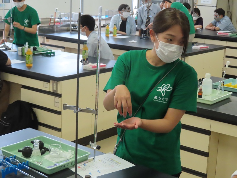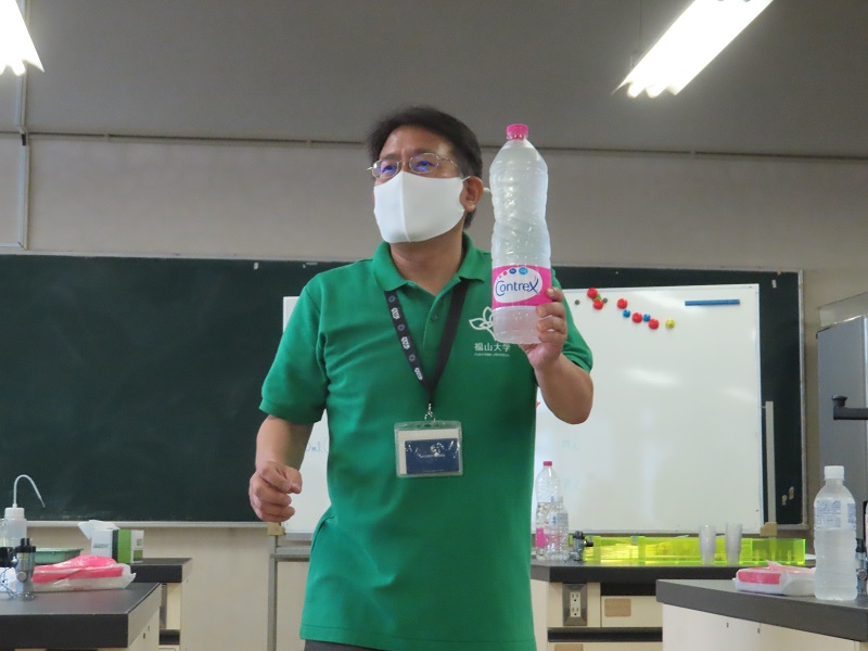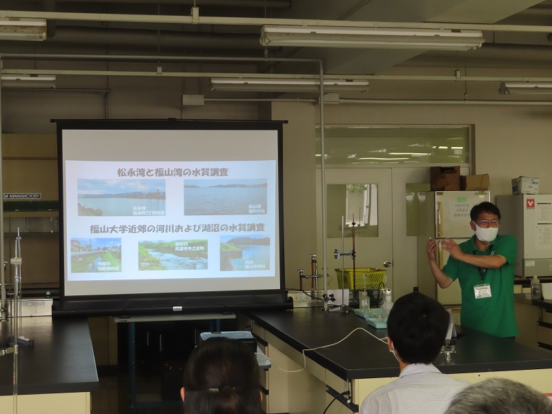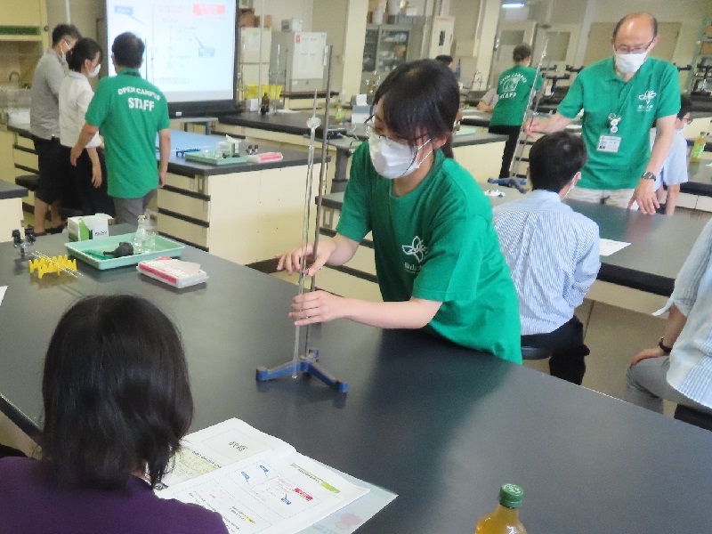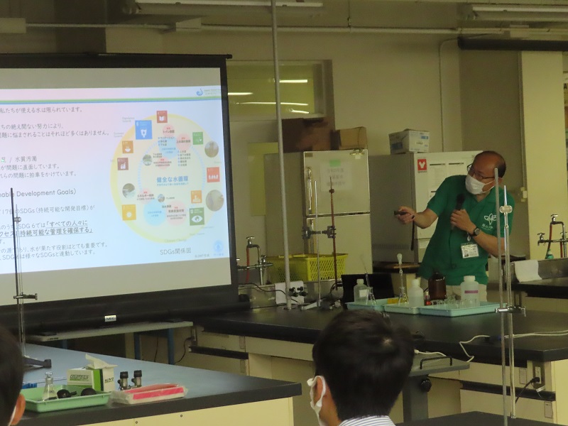まずは岩本学科長がSDGsと絡めて水を分析することの重要性を解説しました。その後、太田教授が生物工学科で実施している環境分析学実験を例に、水質の化学的分析手法について紹介し、参加者には、実際に市販の水の硬度を「キレート滴定」という手法を使って調べる実験を行ってもらいました。