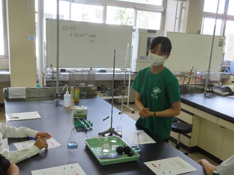 実験は、市販の水の中に含まれているカルシウムやマグネシウムの量を測るために、それらの金属を包み込んであげるキレート剤を入れて、どのくらいの量のキレート剤を入れたら、指示薬の色が変わるのかを調べることで、水の硬度を調べました。一見難しそうに聞こえますが、実験作業は4年生の学生が手取足取り説明しました。