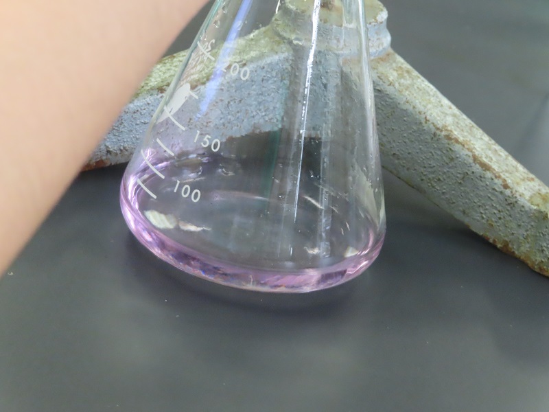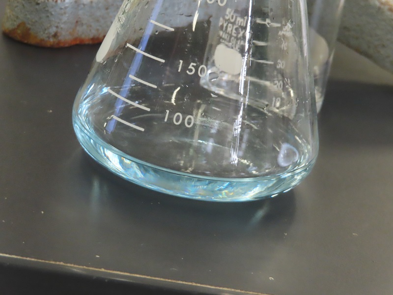 キレート剤をビュレット(上の写真の細長いガラス器具)から少しずつ水に入れて、しばらくすると色が赤から青に変わります。キレート剤の量を測り、頭をうーんとひねらせ、硬度を計算しました。