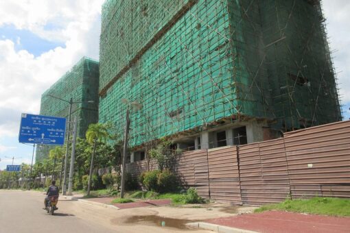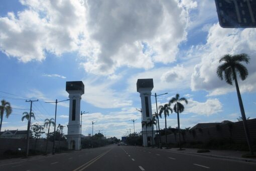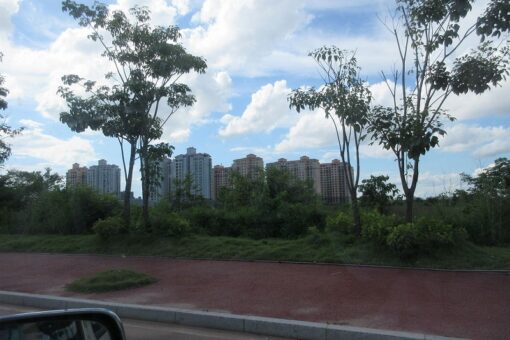 さらにビエンチャン市内に近づくと、一帯一路政策で投資の見返りに中国が買い上げた土地の中に、巨大な建物を建築中でした。 途中で投げ出して撤退しないよう祈ります。 巨大な門もあります。 このあたりの道は、道路標識も中国語です。 でかさ、強さを見せつけているのです。 これがラオスの実態です。