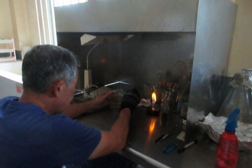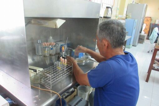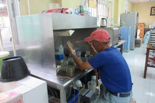 井上さんをしっかり鍛えています。 寒天培地を作って、サンプルから生えてきたコロニーを釣菌して、そして濁ってきた液体培地を寒天培地に塗布(スプレッド)してもらいました。 なかなか覚えの早い年寄りですよ(笑)。 今回の目的の一つは井上さんに酵母の分離技術を身に着けてもらうことですので、辛抱強くご教授いたしました。
