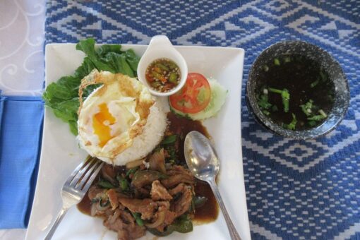 スファヌボン大学を後にして、2~3か所立ち寄った後、昼食です。 豚肉の野菜炒めと目玉焼き、スープです。 先ほどの大学の食品科学科が開発したという、メコンの川ノリもいただきました。 結構おいしかったです。 このあとこのレストランから生物工学科の先生たちとつないで、Zoom ミーティングをしました。