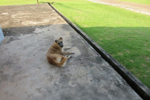 スコールもなく清々しい朝です。 マスコットの犬も機嫌よく伸びています。