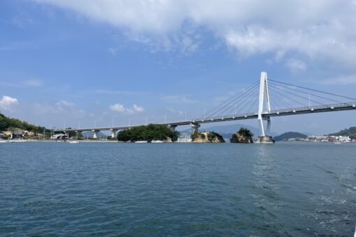 調査は朝から始まります。天気が良く波も穏やかな瀬戸内海は格別です。しまなみの島々にかかった橋の下を通りながら、スナメリを探します。