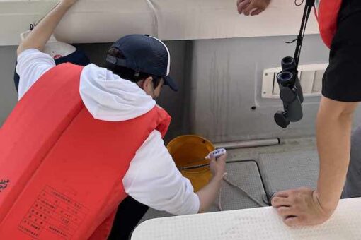 双眼鏡やGPSなど調査道具を持って船に乗り込みます。調査中は双眼鏡でスナメリを探しつつ、位置や天候、水温などを記録します。