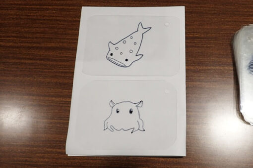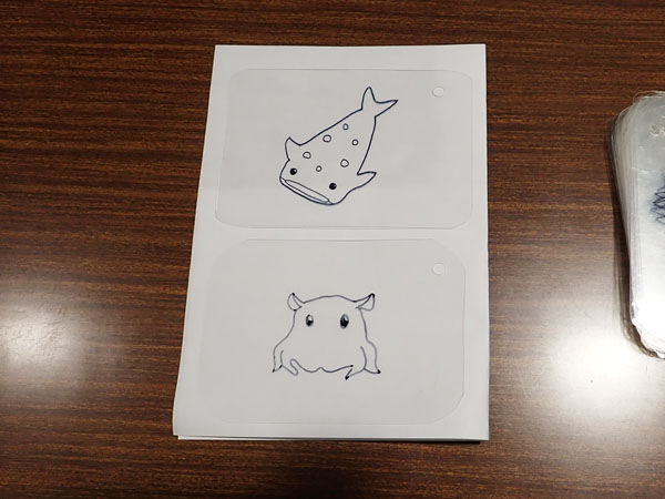 プラバンは海洋生物の下絵を書いたものを準備します。当日は参加者がこれに色を塗ったり、絵や文字を描きたしたりして、オーブンで固めてアクセサリーにします。