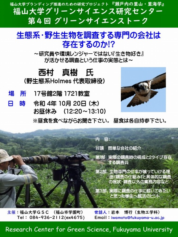野生動物・生態系調査会社の代表を務める西村真樹さんに、『生態系・野生生物を調査する専門の会社は存在するのか? ~研究員や環境レンジャーではない生き物好きが活かせる調査員という仕事の実態とは~』というタイトルでご講演頂きます。 生態系・野生生物調査の会社ではどのような事が行われているのか? どんな仕事をしているのかについて学ぶことができると思います。 日時は大学祭前日(10/20)の木曜日のお昼休み、場所は17号館生物工学科2階の1721教室で、主に学生向けのイベントです。