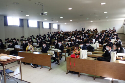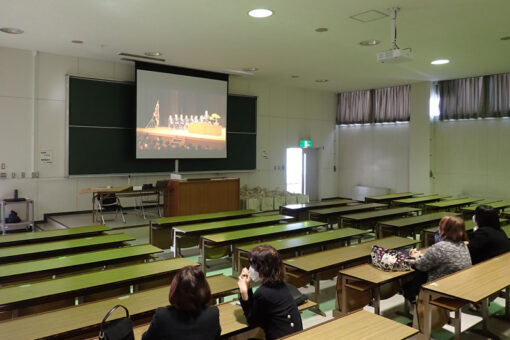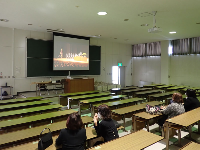 10時から大学会館で行われた全学の学位記授与式の様子は、会場で見ることのできない関係者のためにYouTubeで動画配信されました。海洋生物科学科では、学科別行事の会場である2424教室を開放して、希望された保証人に式典の動画中継を見ていただきました。
