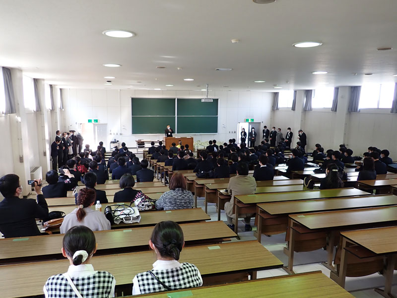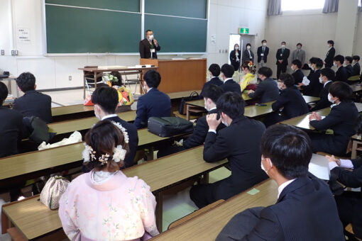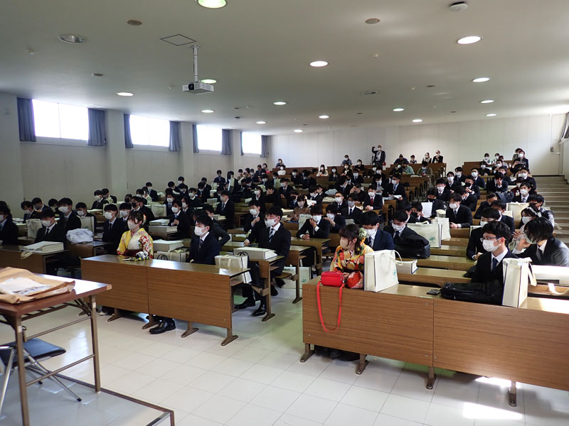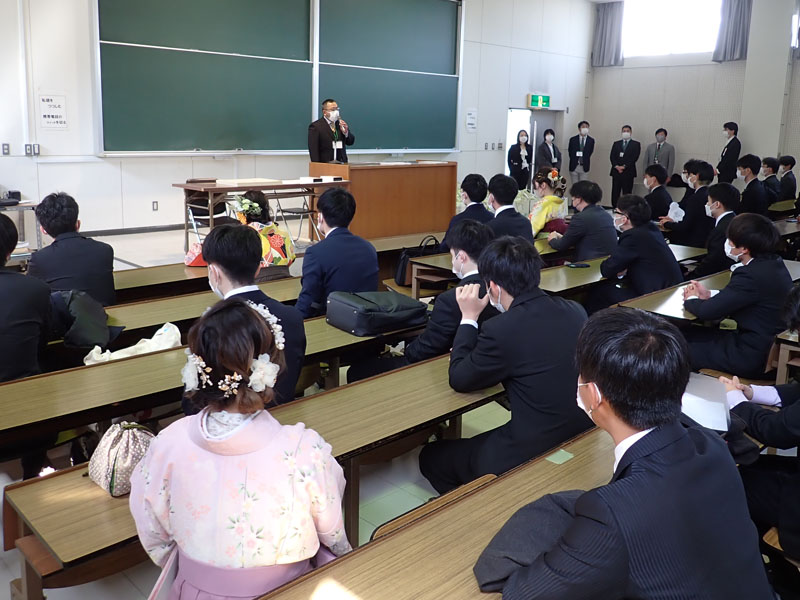 全学の式典が終わり、学科の教員一同が迎える中、卒業生たちが教室に集まってきました。教室の後方では保証人の皆さまにも参加していただきました。