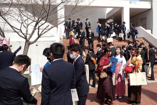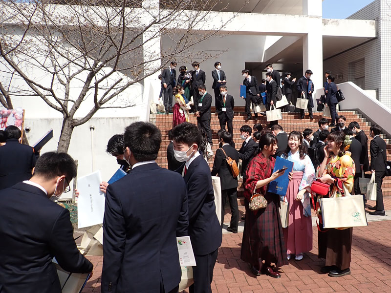会が終わった後には、卒業生の皆さんが教室前の広場で、仲間と記念写真を撮ったり、歓談したりして、大学最後のひと時を惜しむように過ごしました。