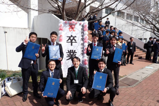 穏やかな晴天の中、2023年3月20日(月)に令和4年度福山大学学位記授与式(卒業式)が行われました。昨年度までは感染対策のため行うことができなかった学科別行事を、今年は3年ぶりに実施することができました。海洋生物科学科の当日の様子を、ブログメンバーの山岸がお伝えします。