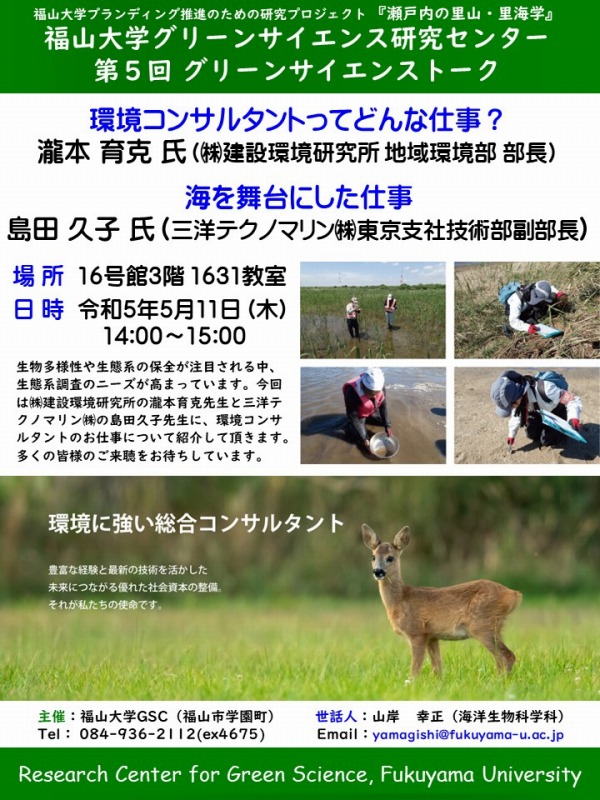 福山大学グリーンサイエンス研究センター主催『第5回グリーンサイエンストーク』を以下の通り行いますので、多数の皆様のご来聴をお待ちします。