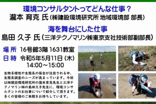 今回は環境調査のお仕事に興味がある学生さんを主なターゲットとして、環境調査会社最大手の(株)建設環境研究所・理事、地域環境部長の瀧本育克先生に「環境コンサルタントってどんな仕事?」というタイトルで、また三洋テクノマリン㈱の島田久子先生に「海を舞台にした仕事」というタイトルでご講演頂きます。世話人は海洋生物科学科の山岸幸正教授です。