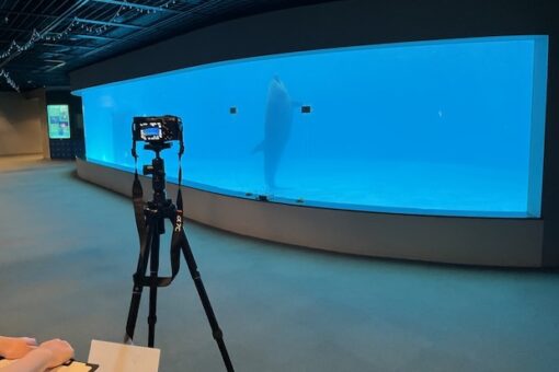 認知実験ではトレーナーさんにイルカに合図を出してもらい、イルカの動きをカメラで撮影します。写真に写っている水槽に貼り付けた黒いものは水中マイクです。