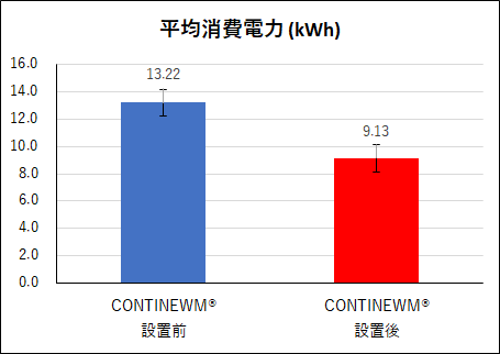 結果は下のグラフに示しました。7日間の平均気温それぞれ5.2℃の中、CONTINEWM®設置前は平均13.22 kWh、設置後で平均9.13 kWh、約31%の消費電力削減となりました!