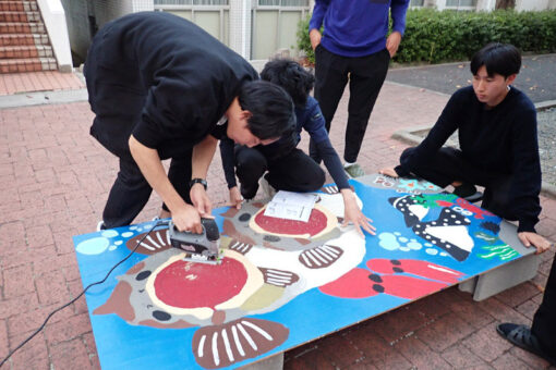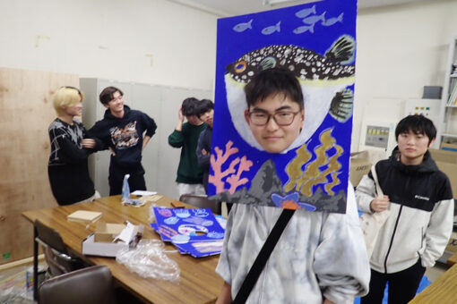外では、16号館の入口に設置する「映える」顔出しパネルの作成が進んでいます。いろいろな海のモチーフから顔を出して、ここでしか撮れない一枚を撮影しましょう!