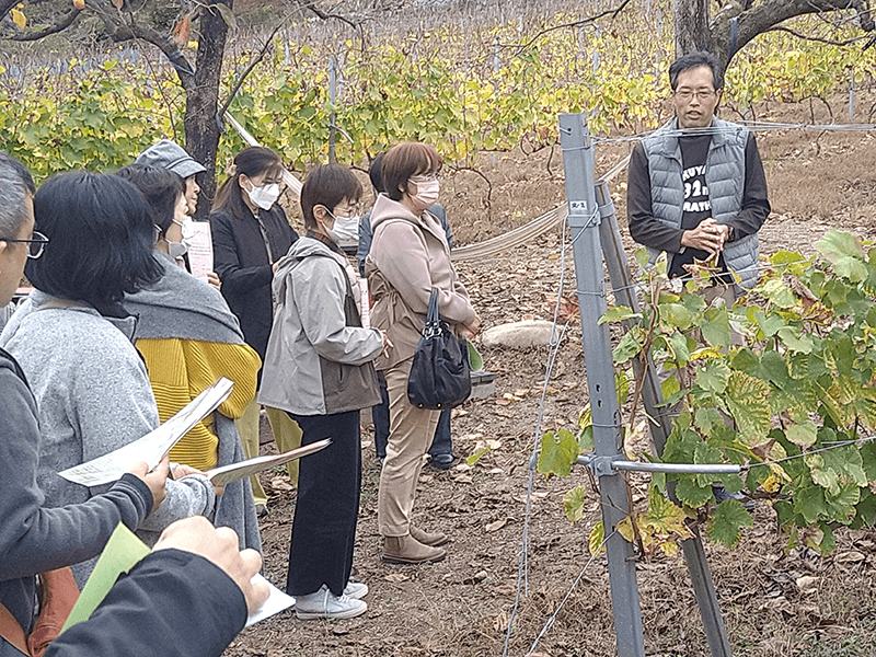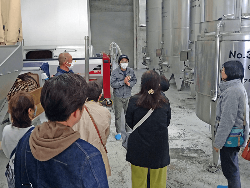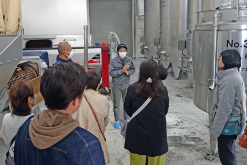 工場では本学生命工学部食品工学科(現・生命栄養科学科)卒業生の峯松醸造長から醸造所や山野峡ブドウの特徴について解説いただきました。3軒のワイナリーの中では規模が小さく、手間暇を惜しまず丁寧に仕込んでいるとのこと。