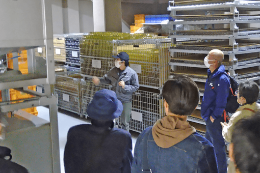 まず最初に訪れたのは世羅町にあるせらワイナリーです。案内してくれたのは弱冠24歳で醸造責任者となった、生物工学科卒業生の橋本君です。