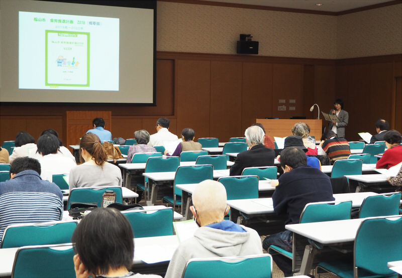 まず、福山市保健所 健康推進課 次長の森川先生より、「福山市食育推進計画2018」についてご講演をいただきました。