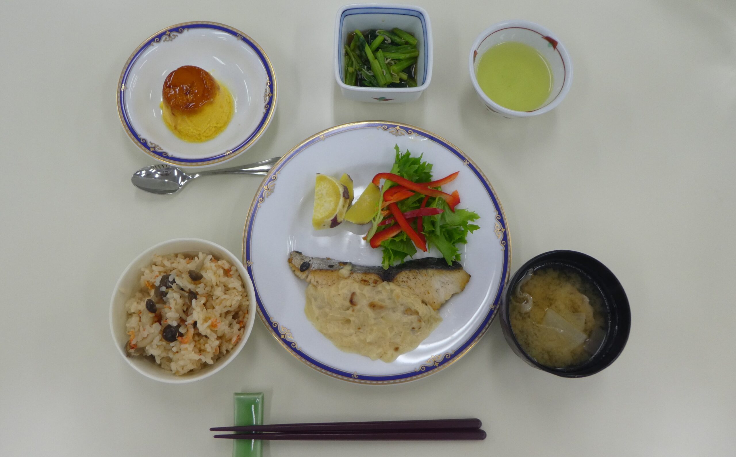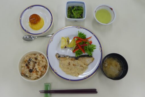 今回のメニューは、『しめじご飯、白身魚のムニエル ~ミルクソースがけ~、小松菜とじゃこ浸し、豚汁、濃厚かぼちゃプリン』でした。