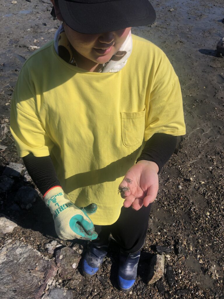 海洋生物研究会での松永湾清掃活動中にシオマネキを見つけた舛田さん。