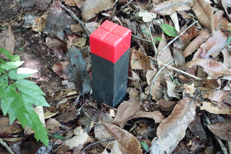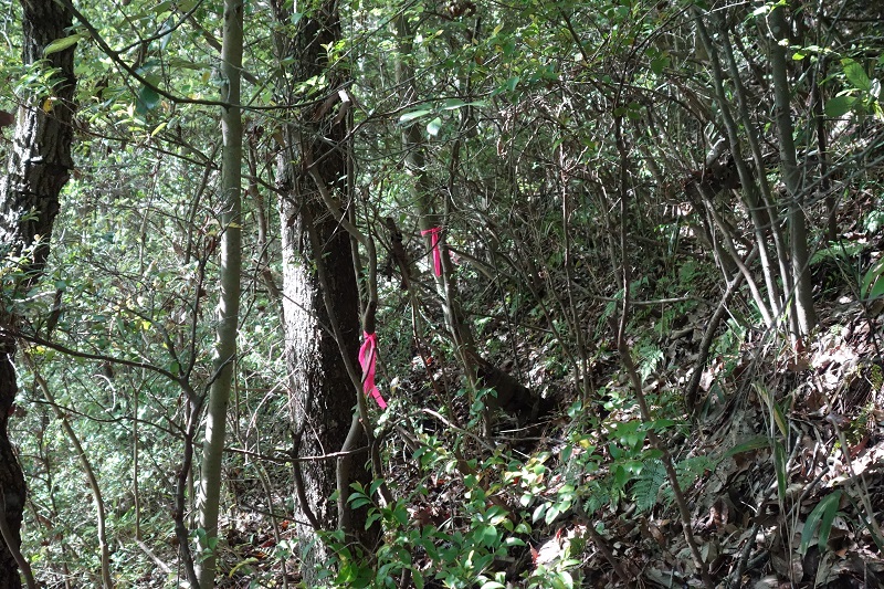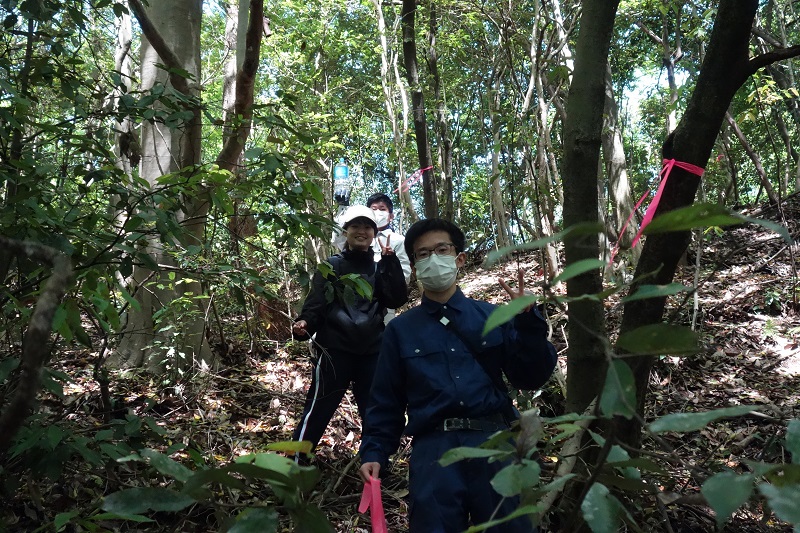 4年生の卒業研究の目的は、カメラトラップを使って、この山にどのような哺乳類が生息しているのかを調べることです。カメラをしかけられそうな場所を探しながら、道なき道に目印をつけていきます。ピンクテープや境界杭を使いながら、また次に山に来た時に同じ場所に来ることができるように道しるべを付けて行きます。森の中では、すぐに道を見失います。季節が変わると、草木の成長もあり、その雰囲気はガラッと変わってしまうのです。そのため、こうした目印は重要です。
